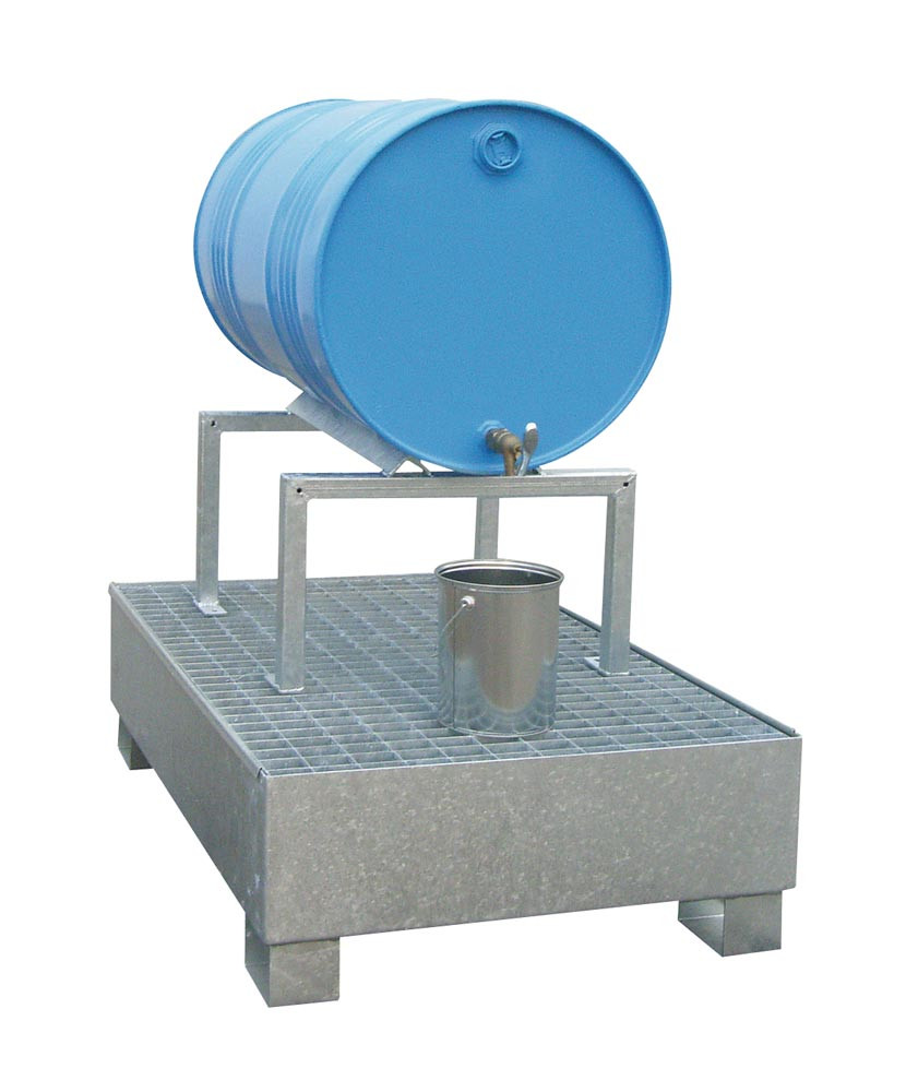 · Komplett feuerverzinkt · Mit festen Fassauflagen · Fassauflage nach vorne geneigt für einfachere Fassentleerung · Nur nutzbar mit Auffangwannen für mindestens 2 Stück 200-l-Fass