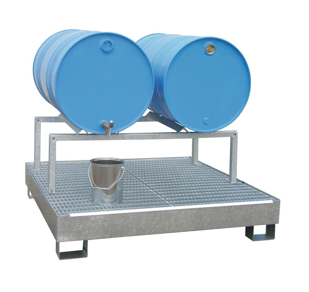 · Komplett feuerverzinkt · Mit festen Fassauflagen · Fassauflage nach vorne geneigt für einfachere Fassentleerung · Nur nutzbar mit Auffangwannen für mindestens 2 Stück 200-l-Fass