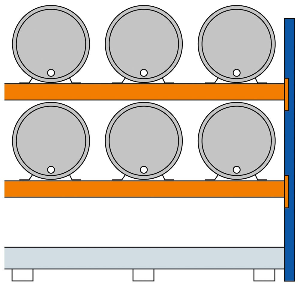 ∙ Rahmen aus Stahl, blau kunststoffbeschichtet ∙ Verstrebungen aus Stahl, verzinkt ∙ Holme aus Stahl, orange kunststoffbeschichtet ∙ Auffangwannen und Fassauflagen verzinkt ∙ Sonderausführungen wie z. B. Fass-Freilagerregale komplett mit Dach, sind auf Anfrage lieferbar ∙ Belastung pro Ebene bis 2300 kg (bei gleichmäßig verteilter Last)