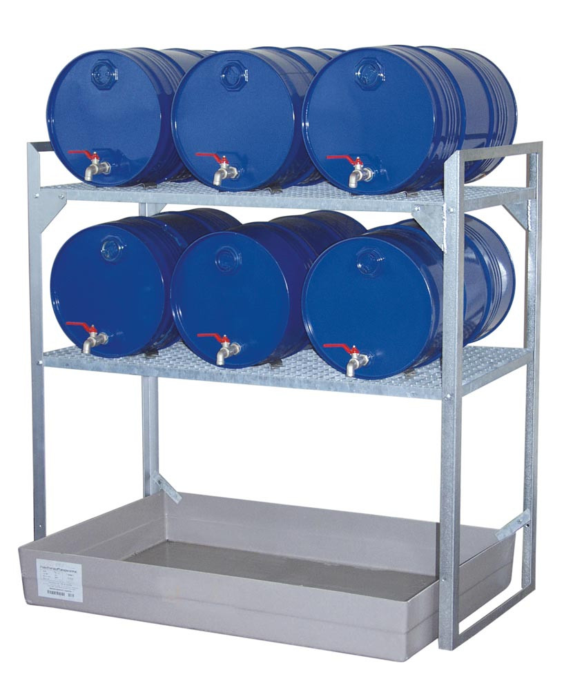 Fassregal, Stahl verzinkt, 2 Gitterrostebenen für 60-l-Fässer und Kleingebinde, GFK-Auffangwanne 150 l, BxTxH 1320x800x1300 mm