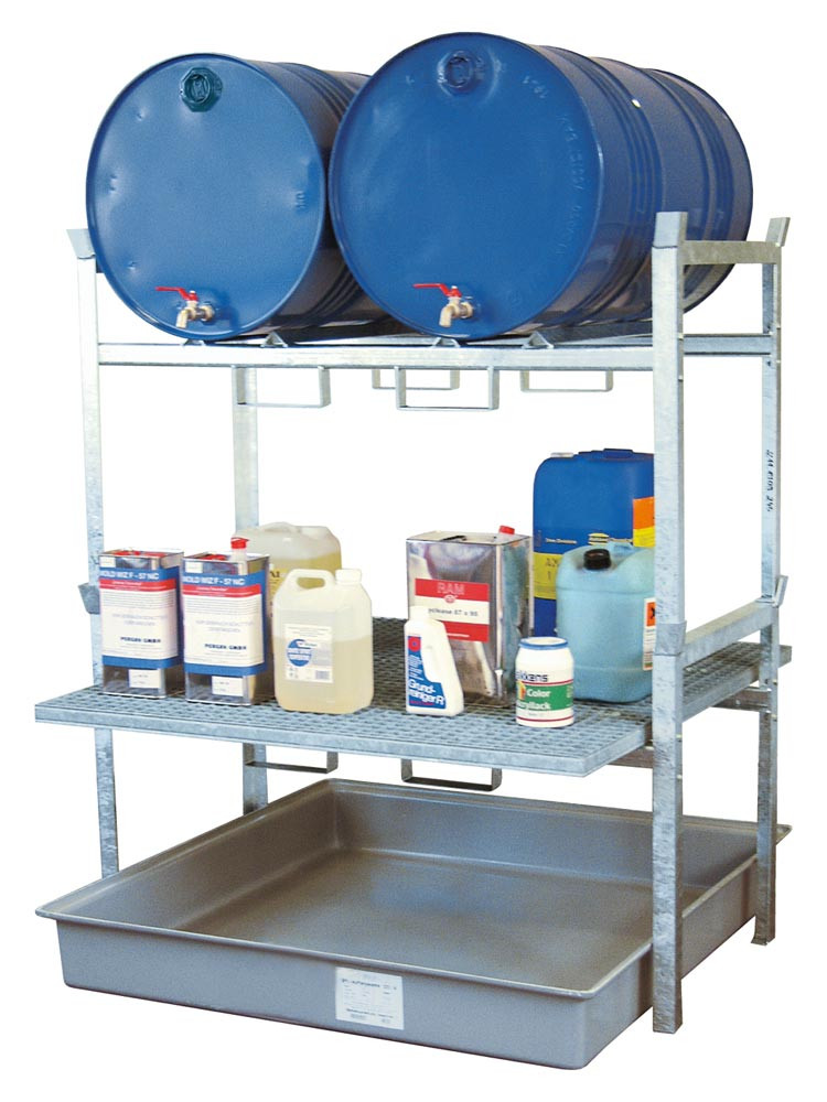 Fassregal, Stahl verzinkt, mit Fassauflage für 2x200-l-Fässer und 1 Gitterrostauflage, GFK-Auffangwanne Auffangvolumen 220 l, BxTxH 1410x1280x1620 mm