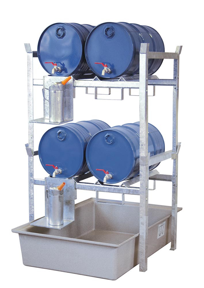 Fassregal, Stahl verzinkt, mit Fassauflage für 4x60-l-Fässer oder 2x200-l-Fässer, GFK-Auffangwanne Auffangvolumen 220 l, BxTxH 990x1280x1620 mm E812121