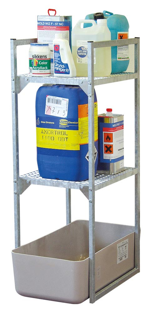 Fassregal für Kleingebinde, mi 2 Gitterrostauflagen für Kleingebinde, Stahl, verzinkt, GFK-Auffangwanne 65 l, BxTxH 450x820x1310 mm