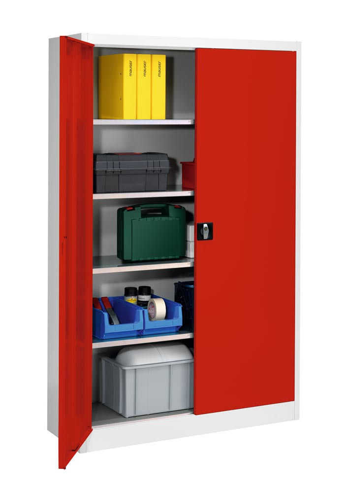 Flügeltürenschrank, 4 verz. Fachböden, BxTxH 1200x420x1950 mm, RAL7035 lichtgrau/RAL3000 feuerrot