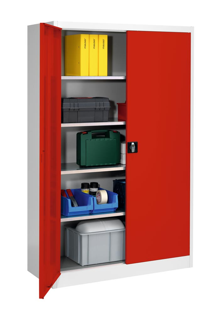 Flügeltürenschrank, 4 verz. Fachböden, BxTxH 1200x500x1950 mm, RAL7035 lichtgrau/RAL3000 feuerrot