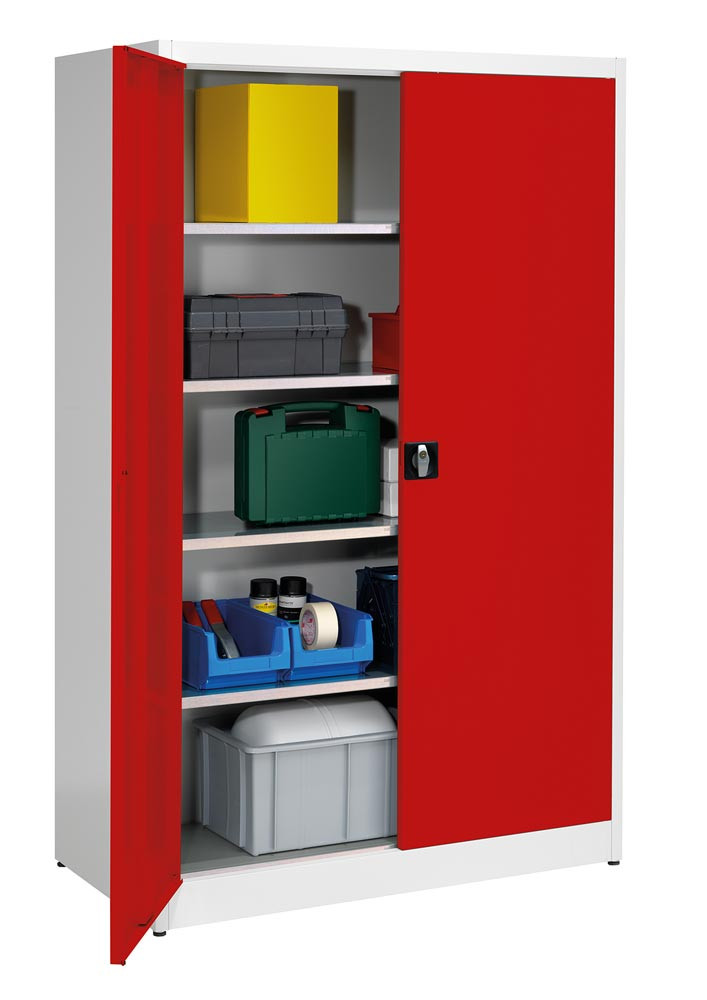Flügeltürenschrank, 4 verz. Fachböden, BxTxH 1200x600x1965 mm, RAL7035 lichtgrau/RAL3000 feuerrot