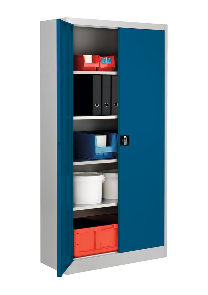 Flügeltürenschrank, 4 verz. Fachböden, BxTxH 950x420x1950 mm, RAL7035 lichtgrau/RAL5010 enzianblau