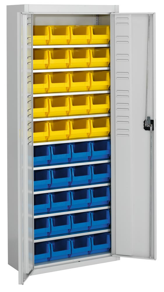 ∙ Komplett bestückter Magazin- und Kleinteileschrank ∙ Verschweißtes Gehäuse aus Stahlblech ∙ Stahltüren mehrfach gekantet, verstärkt und in Stahl-Drehbolzen gelagert ∙ Versenktes Drehgriff-Zylinderschloss mit Dreiriegel-Verschluss ∙ Hochwertige Beschichtung ∙ Fachböden aus verzinktem Stahlblech