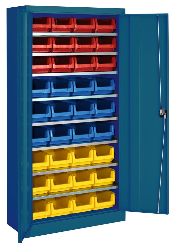 Flügeltürenschrank, BxTxH 950x420x1950 mm, RAL 5007 brillantblau, Fachlast 80 kg, mit Kästen: 12xGr. 3 rot, 8xGr. 3z blau, 12xGr. 3z gelb