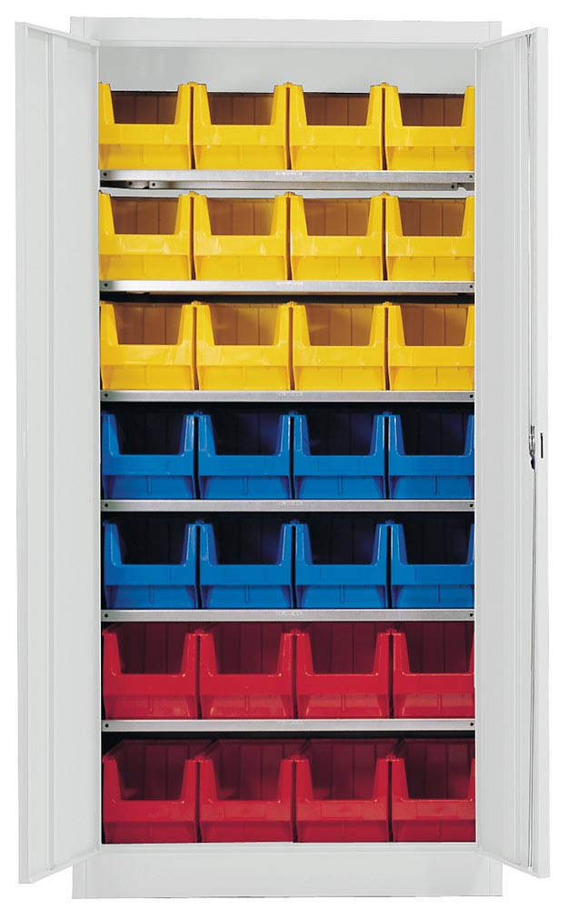 Flügeltürenschrank, BxTxH 950x420x1950 mm, RAL 7035 lichtgrau, Fachlast 80 kg, mit Kästen: 8xGr. 3 rot, 8xGr. 3 blau, 12xGr. 3 gelb