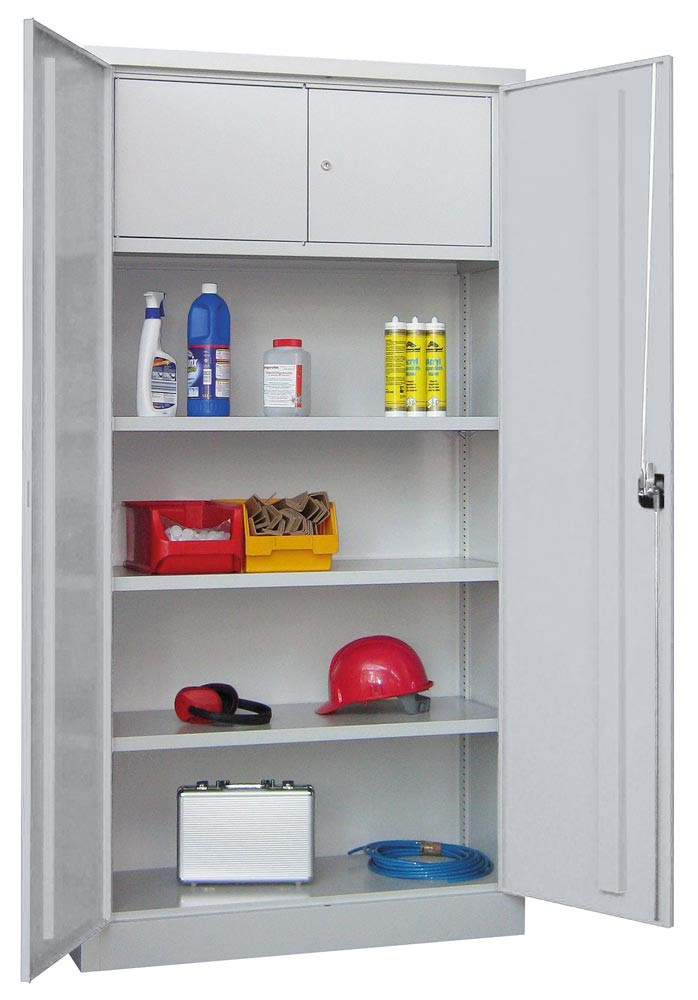 · Stabile Stahlblechkonstruktion, Böden fest verschweißt · Oberfläche pulverbeschichtet · Schränke mit gemeinsam verschließbaren Türen und Verstärkungstaschen ∙ Verriegelung mit Zylinderschloss inkl. 2 Schlüsseln ∙ Glatter, ausfegbarer Boden