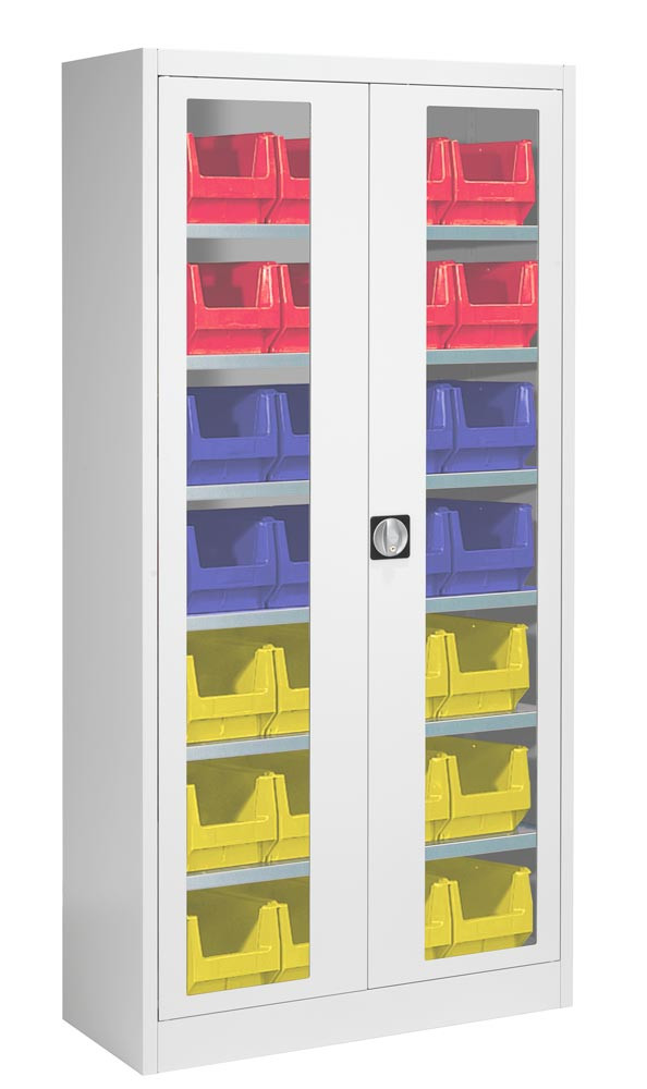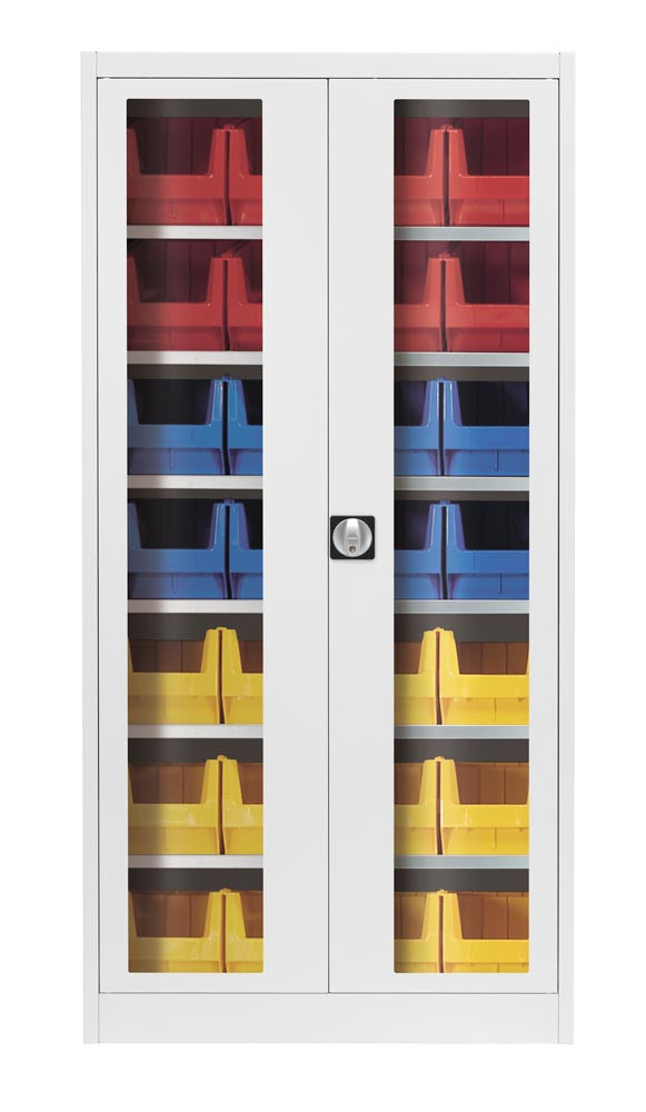 Flügeltürenschrank mit Sichtfenster, 8 Böden, bestückt, BxTxH 950x420x1950 mm, Kästen: 12x Gr. 3z rot, 12xGr. 3z blau, 12xGr. 3z gelb, RAL 6011/6011