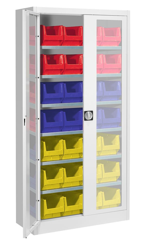 Flügeltürenschrank mit Sichtfenster, 6 Böden, bestückt, BxTxH 950x420x1950 mm, Kästen: 8xGr. 3 rot, 8xGr. 3 blau, 12xGr. 3 gelb, RAL 5007/5007 E1991060