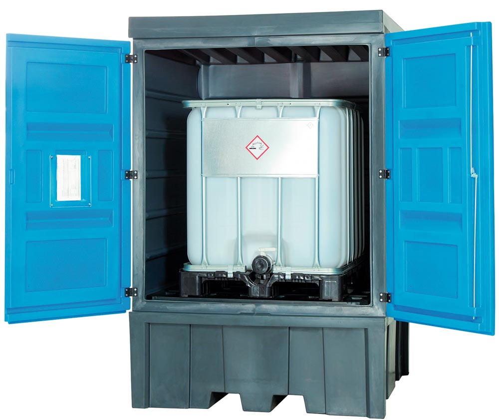 ∙ Aus Polyethylen (PE) · Stabil und standsicher mit integrierter Auffangwanne ∙ Serienmäßig mit Einfahrtaschen für Staplertransport ∙ Mit allgemeiner bauaufsichtlicher Zulassung des DIBt-Berlin ∙ Hohe Beständigkeit gegen Säuren, Öle und Laugen · Die Anlieferung erfolgt montiert · Vorbereitung zur Bodenverankerung (Befestigungsset als Zubehör separat erhältlich)