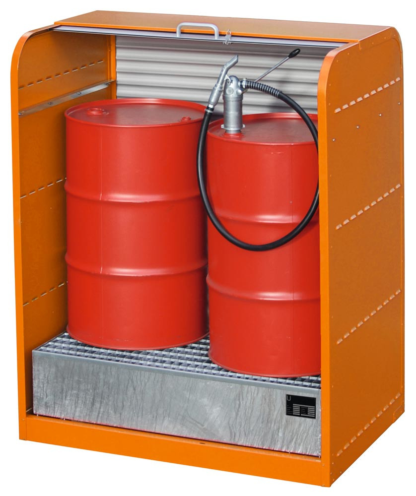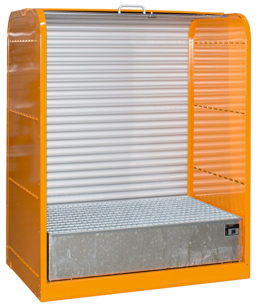 Gefahrstoff-Depot für 2x200 l Fässer, BxTxH 1300x870x1610 mm, 1 Wanne Volumen 215 l, Rolllade, RAL 2000