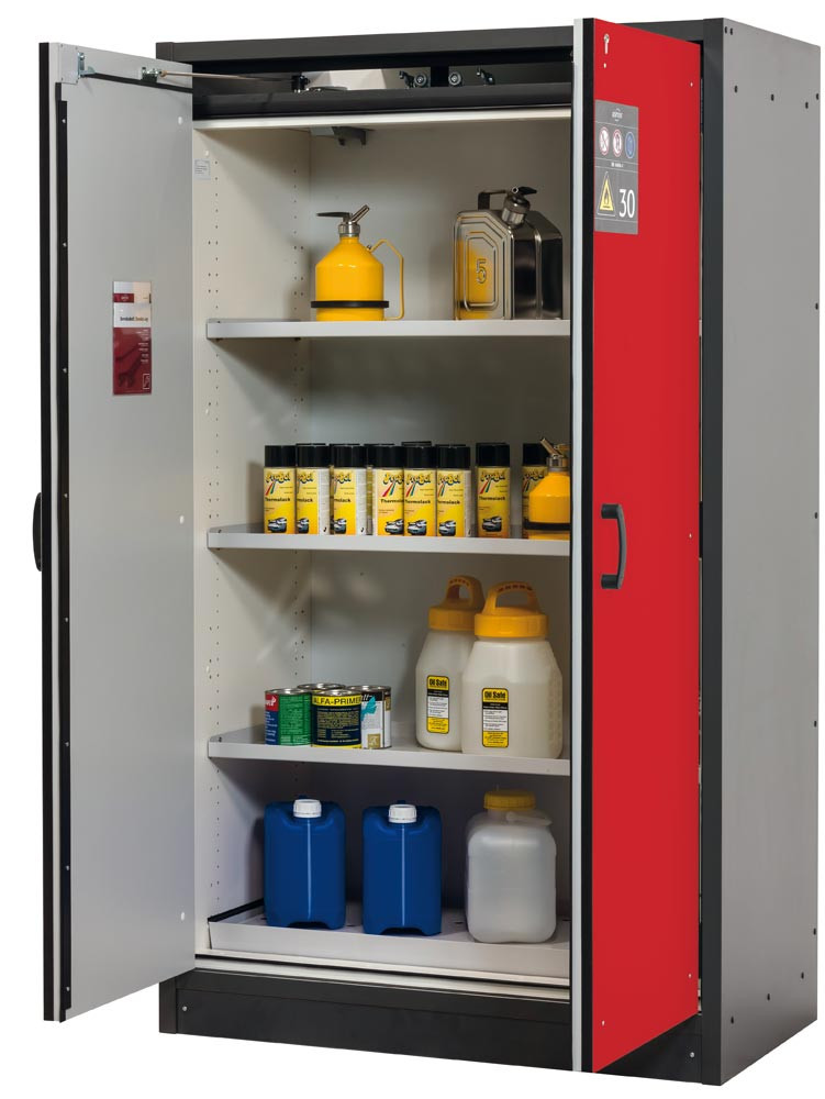 ∙ Integrierter Transportsockel ∙ Außenkorpus aus flammenhemmenden, melaminharzbeschichteten Spezialplatten in anthrazitgrau, ähnlich RAL 7016, Türfront aus Stahlblech mit hochwertiger Struktur-Pulverbeschichtung ∙ Für die sichere Lagerung von Gefahrstoffen in Arbeitsräumen gemäß DIN EN 14470-1 und TRGS 510