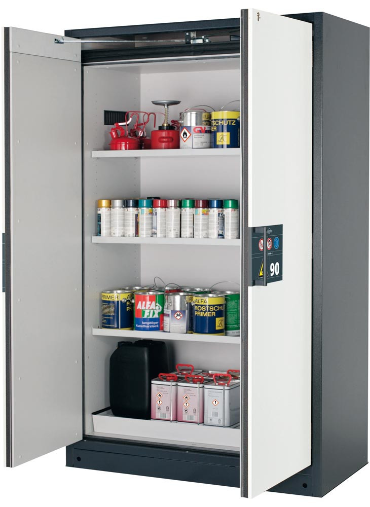 ∙ Extrem robuste Bauweise ∙ Kratzunempfindliche Strukturlackierung ∙ Mit einer Hand zwei Türen öffnen (AGT)Serienmäßige Tür-Schließ-Automatik (TSA) schließt nach ca. 60 Sekunden die arretierten Türen, optisches und akustisches Warnsignal vor Türschließung · Sicheres Arbeiten mit integrierter Türfeststellanlage ∙ Im Brandfall schliessen die Türen selbständig über den eingebauten Thermoauslöser ∙ Feuersicherheit 90 Minuten ∙ Manipulationssicheres Schloss mit Anzeige des momentanen Schließzustandes (Integration in Schließanlage möglich) ∙ Fest integrierter, unterfahbarer Sockel (Sockelblende optional erhältlich) ∙ Leichtes Umsetzen mit Gabelhubwagen möglich ∙ Standardkorpus RAL 7016 anthrazit