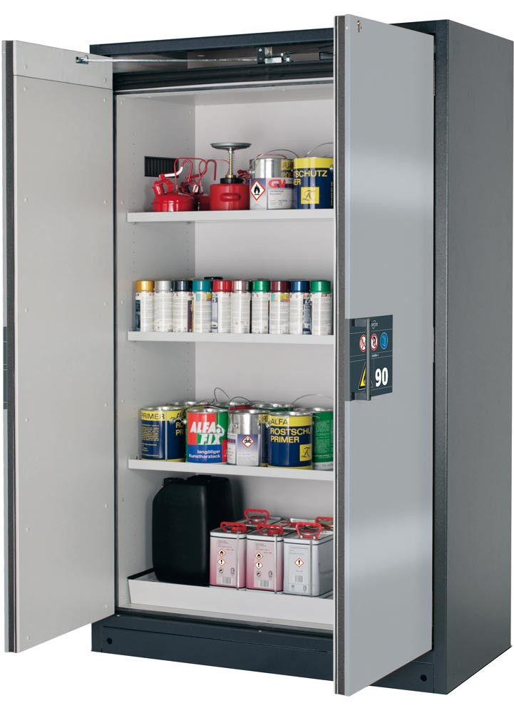 ∙ Extrem robuste Bauweise ∙ Kratzunempfindliche Strukturlackierung ∙ Mit einer Hand zwei Türen öffnen (AGT) ∙ Serienmäßige Tür-Schließ-Automatik (TSA) schließt nach ca. 60 Sekunden die arretierten Türen, optisches und akustisches Warnsignal vor Türschließung · Sicheres Arbeiten mit integrierter Türfeststellanlage ∙ Im Brandfall schliessen die Türen selbständig über den eingebauten Thermoauslöser ∙ Feuersicherheit 90 Minuten ∙ Manipulationssicheres Schloss mit Anzeige des momentanen Schließzustandes (Integration in Schließanlage möglich) ∙ Fest integrierter, unterfahbarer Sockel (Sockelblende optional erhältlich) ∙ Leichtes Umsetzen mit Gabelhubwagen möglich ∙ Standardkorpus RAL 7016 anthrazit