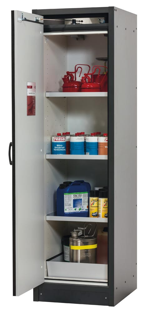 ∙ Integrierter Transportsockel ∙ Außenkorpus aus flammenhemmenden, melaminharzbeschichteten Spezialplatten in anthrazitgrau, ähnlich RAL 7016, Türfront aus Stahlblech mit hochwertiger Struktur-Pulverbeschichtung ∙ Für die sichere Lagerung von Gefahrstoffen in Arbeitsräumen gemäß DIN EN 14470-1 und TRGS 510