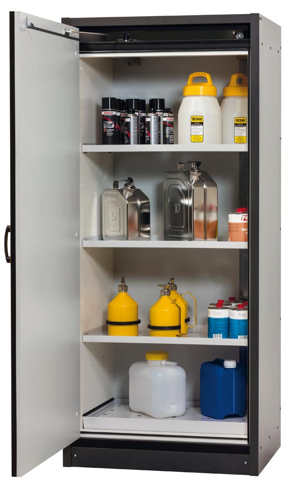 ∙ Integrierter Transportsockel ∙ Außenkorpus aus flammenhemmenden, melaminharzbeschichteten Spezialplatten in anthrazitgrau, ähnlich RAL 7016, Türfront aus Stahlblech mit hochwertiger Struktur-Pulverbeschichtung ∙ Für die sichere Lagerung von Gefahrstoffen in Arbeitsräumen gemäß DIN EN 14470-1 und TRGS 510
