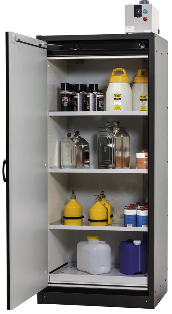 ∙ Integrierter Transportsockel ∙ Außenkorpus aus flammenhemmenden, melaminharzbeschichteten Spezialplatten in anthrazitgrau, ähnlich RAL 7016, Türfront aus Stahlblech mit hochwertiger Struktur-Pulverbeschichtung ∙ Für die sichere Lagerung von Gefahrstoffen in Arbeitsräumen gemäß DIN EN 14470-1 und TRGS 510