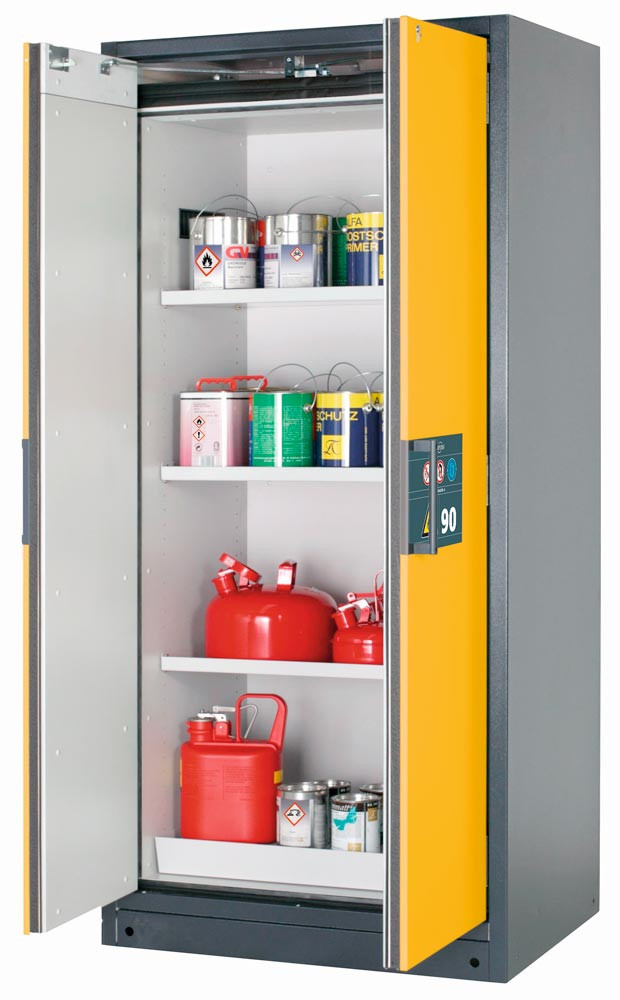 Gefahrstoffschrank, BxTxH 893x615x1953 mm, 3 Böden, 1 Auffangwanne mit Lochblecheinsatz, inkl. AGT und TSA, RAL 7016/5010 E1968029