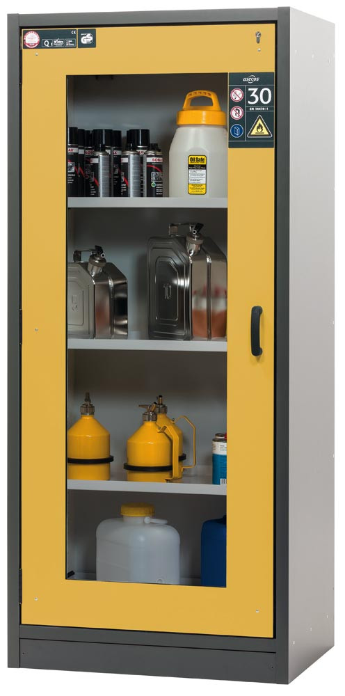 Gefahrstoffschrank m. Sichtfenstertüren, BxTxH 864x620x1947 mm, 3 Böden, 1 Bodenwanne, 1 Lochblech, FWF 30, ähn. RAL 7016/3020 E1988314