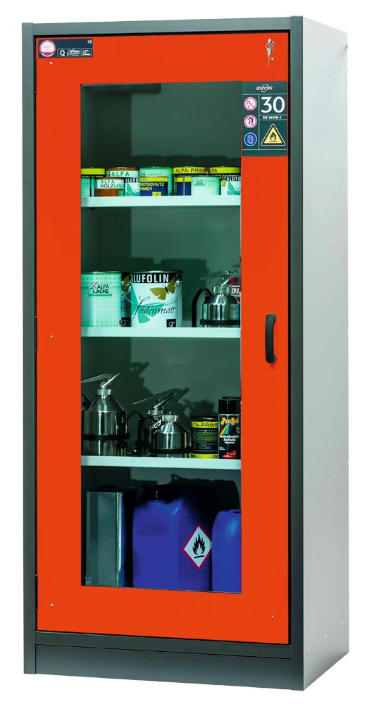 Gefahrstoffschrank m. Sichtfenstertüren, BxTxH 864x620x1947 mm, 3 Böden, 1 Bodenwanne, 1 Lochblech, FWF 30, ähn. RAL 7016/1004 E1988312