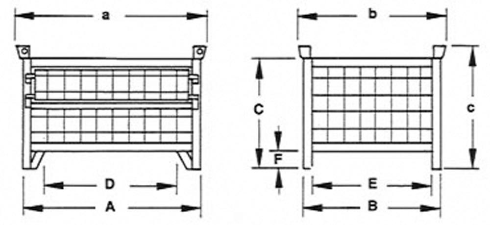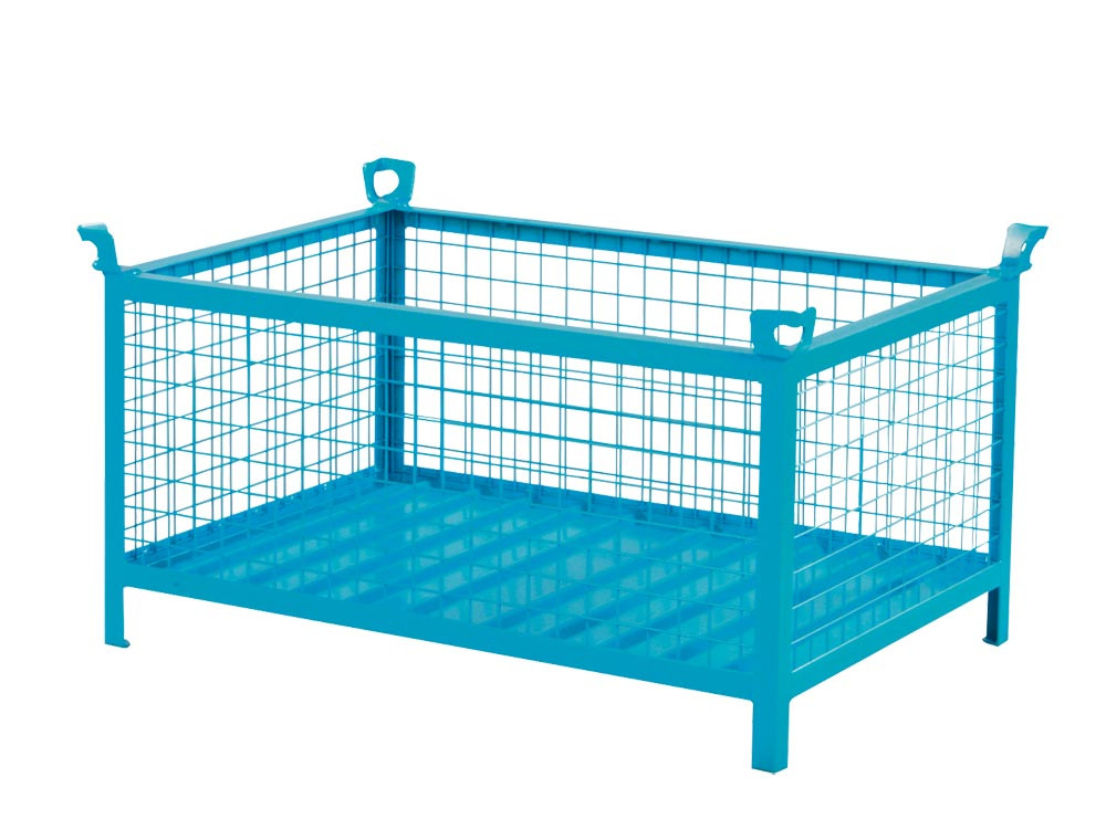 ∙ Robuste Stahlblechkonstruktion ∙ Seitenwände aus Drahtgitter, 4 mm stark, 50 x 50 mm Maschenweite ∙ Unter- und Oberrahmen sowie Eckständer aus Winkelprofilen ∙ Rahmenstützen 40 x 40 x 4 mm · Vier angeschweißte Fangecken (6 mm stark) zum Stapeln ∙ Boden (2 mm stark) mit Rundsicken verstärkt ∙ Unterfahrhöhe 100 mm