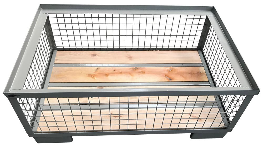 · Rahmen aus Winkeleisen · Seitenwände mit Drahtgitter 50 x 50 x 4,0 mm · Boden mit Stahlunterzügen und Massivholzeinlage · Füße aus Kastenprofil · Unterfahrhöhe 100 mm · Lackierung in RAL 7030 steingrau · Maximale Stapelanzahl: 4 Stück · Trag- und Auflastangaben sind Maximalwerte und gelten bei gleichmäßig verteilter Last
