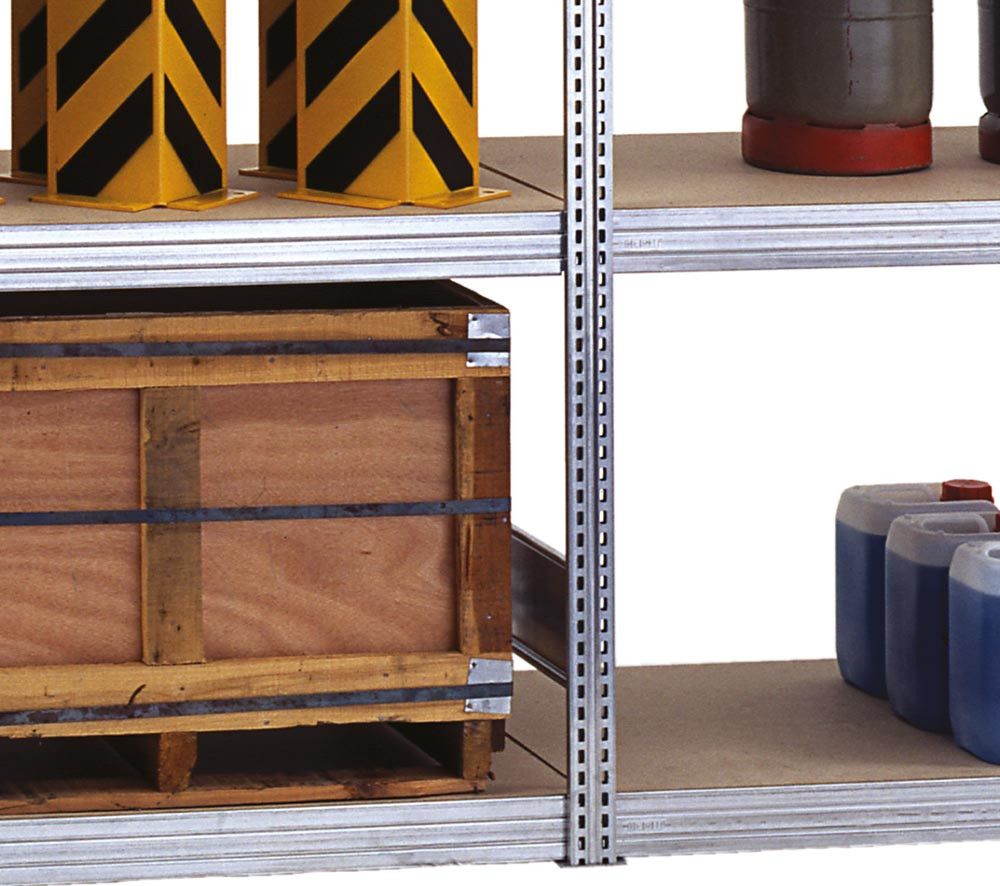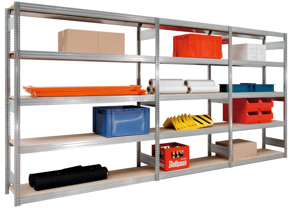 Großfachregal, verzinkt, Grundfeld, 7 Lagerebenen mit Spanplattenboden, Fachlast 350 kg, BxTxH 1695x300x3000 mm