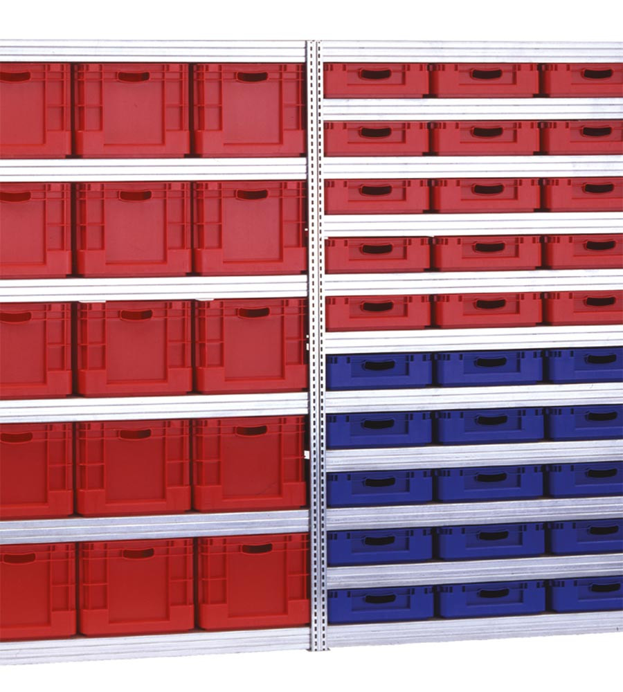 ∙ Das Großfachsteckregalsystem ist aufgrund seiner durchdachten Konstruktionsweise ganz besonders für die Einlagerung von schweren Lasten geeignet ∙ Als modulares Stecksystem bietet es vielfache Anwendungsmöglichkeiten für sperrige und voluminöse Teile ∙ Durch Grund- und Anbaufelder lässt sich das System als Schwerlastregal allen gewünschten Anforderungen anpassen ∙ Durch den Einsatz von Paneelen als Fachbodenebene ist eine Fachlast bis 350 kg und eine Feldlast bis 3500 kg möglich ∙ Die Geometrie der Stufenbalken garantiert eine stabile und verwindungsfreie Anwendung. Als Fachebenen werden Spanplatten (V20E1 hochverdichtet) oder Gitterroste eingesetzt ∙ Die hohen Fach- und Feldlasten sind bei allen Feldbreiten und Feldtiefen gewährleistet