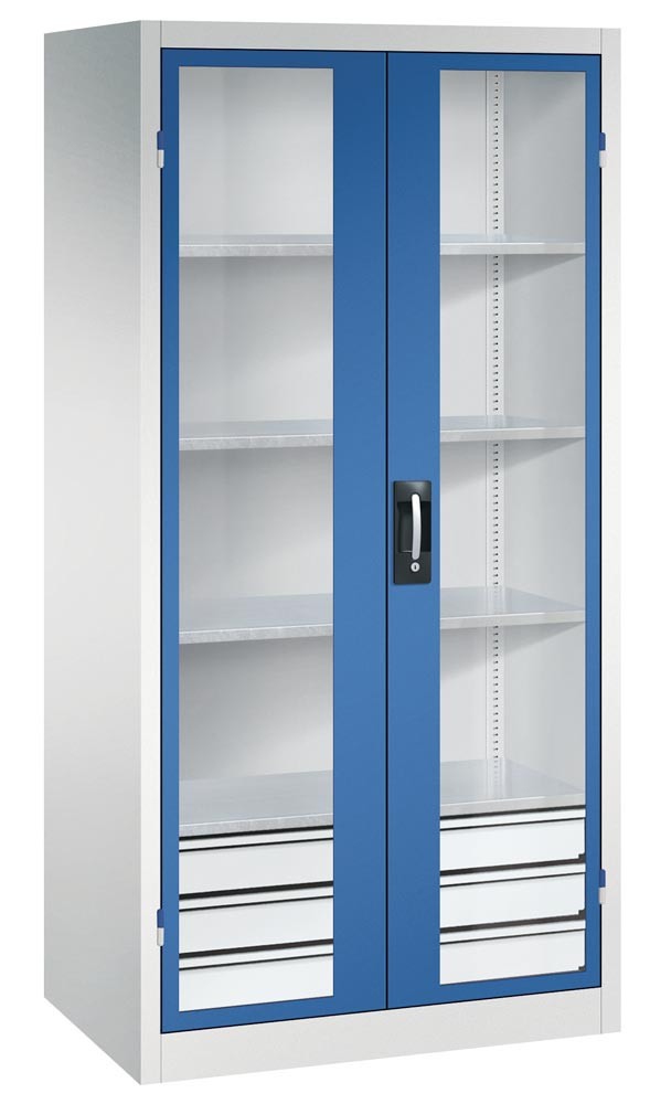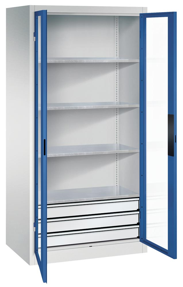 Großraum-Werkzeugschrank mit Sichfensterflügeltüren, 3 Schubladen unten, 4 Verstellböden, BxTxH 930x500x1950 mm, RAL 7035/5010 E1979520