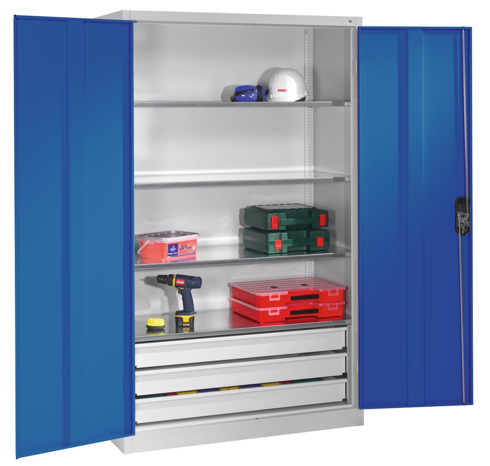 Großraum-Werkzeugschrank mit Vollblech-Flügeltüren, 3 Schubladen unten, 4 Verstellböden, BxTxH 1200x600x1950 mm, RAL 7035/5010