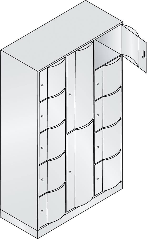 ∙ Alle Modelle mit 100 mm Sockel in Korpusfarbe ∙ Jede Tür mit Zylinderschloss mit 2 Schlüsseln ∙ Türanschlag rechts ∙ Türöffnungsbegrenzer und Wandbefestigung serienmäßig ∙ Alle Schränke mit Belüftungsöffnungen in der Rückwand und 18 mm Abstandhalter ∙ Eine Kombination aus 10 x 336 mm und 2 x 870 mm hohen Abteilen.