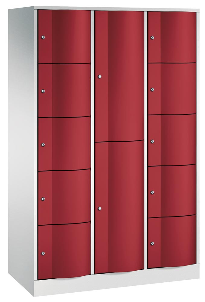 ∙ Alle Modelle mit 100 mm Sockel in Korpusfarbe ∙ Jede Tür mit Zylinderschloss mit 2 Schlüsseln ∙ Türanschlag rechts ∙ Türöffnungsbegrenzer und Wandbefestigung serienmäßig ∙ Alle Schränke mit Belüftungsöffnungen in der Rückwand und 18 mm Abstandhalter ∙ Eine Kombination aus 10 x 336 mm und 2 x 870 mm hohen Abteilen.