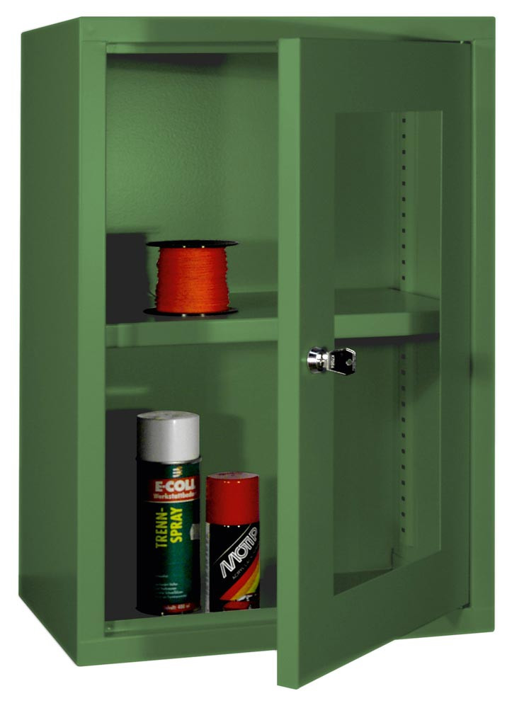 Hängeschrank, 1 Sichtfenstertür, Rückwand glatt, 1 verstellbarer Boden, Zylinderschloss BxTxH 400x300x600 mm, RAL 6011