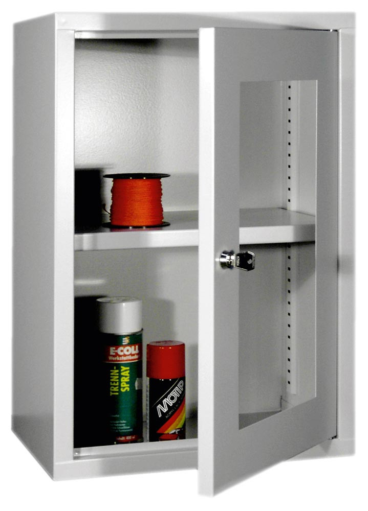 ∙ Stabile, pulverbeschichtete Stahlblechkonstruktion ∙ Türen mit Sichtfenster aus bruchsicherem Acrylglas, durch Zylinderschloss verschließbar ∙ 1 in Schrankfarbe pulverbeschichteter Fachboden gehört zum Lieferumfang ∙ Fachboden im Raster von 17 mm höhenverstellbar
