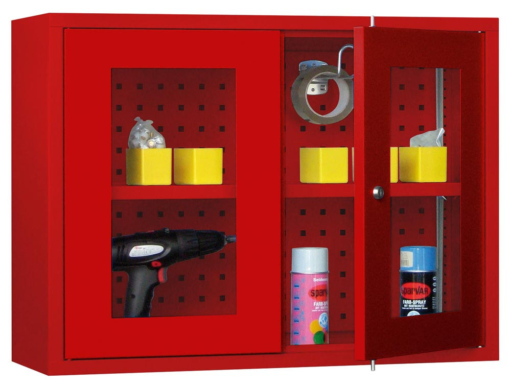 Hängeschrank, 2 Sichtfenstertüren, Rückwand gelocht, 1 verstellbarer Boden, Zylinderschloss, BxTxH 800x300x600 mm, RAL 3000