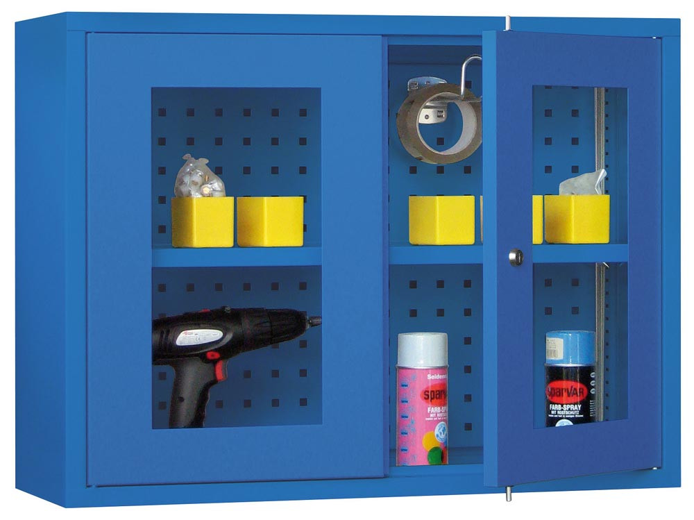 ∙ Stabile, pulverbeschichtete Stahlblechkonstruktion in 2 Breiten ∙ Türen mit Sichtfenster aus bruchsicherem Acrylglas, durch Zylinderschloss verschließbar ∙ Gelochte Schrankrückwand zur Aufnahme von Systemhaken ∙ 1 in Schrankfarbe pulverbeschichteter Fachboden gehört zum Lieferumfang ∙ Fachboden im Raster von 17 mm höhenverstellbar