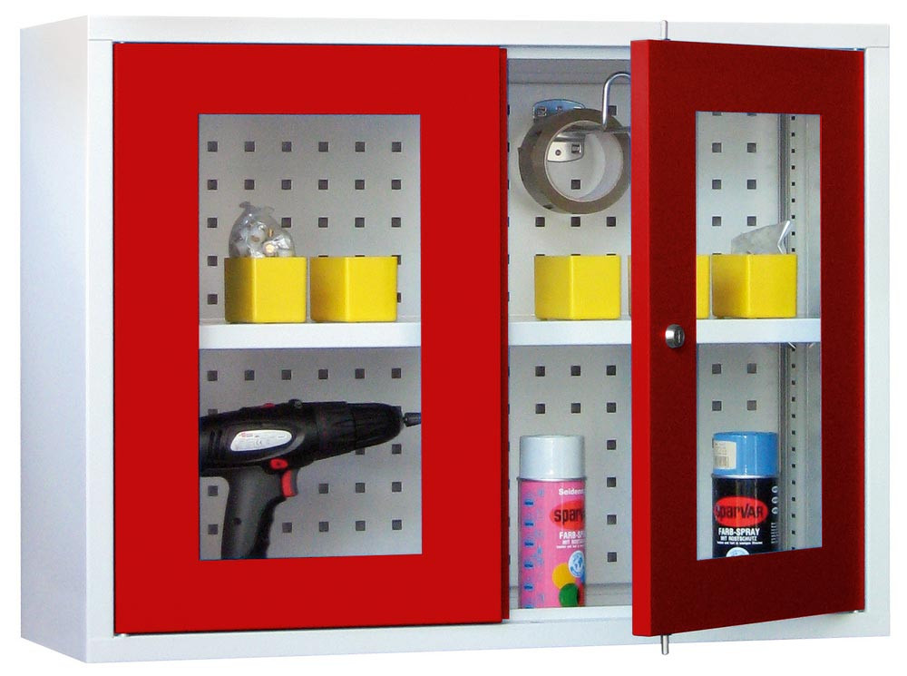 Hängeschrank, 2 Sichtfenstertüren, Rückwand gelocht, 1 verstellbarer Boden, Zylinderschloss, BxTxH 800x300x600 mm, RAL 7035/3000