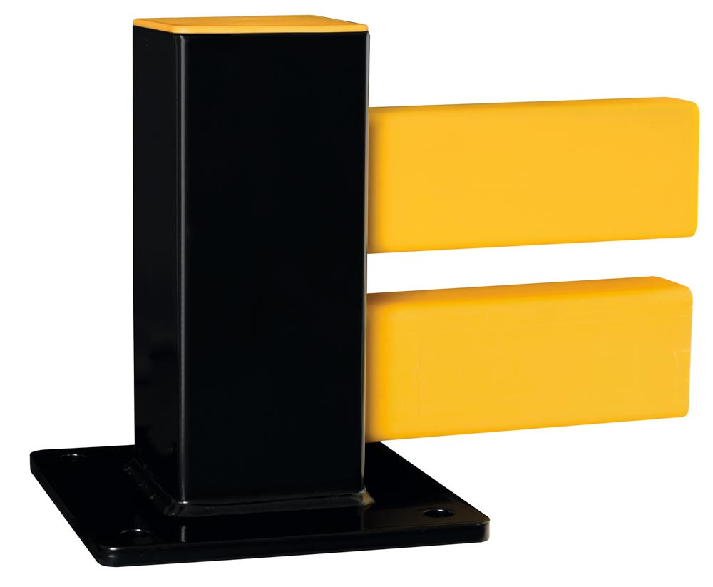 · Vielfältig einsetzbare bodennahe Barriere · Schützt Regalbereiche, Rangierzonen und Wandflächen · Dient als „Abstandhalter“ für Wand-Anbauten sowie als Säulenschutz · Die modulare Bodenbarriere besteht aus niedrigen Stahlpfosten und rückfedernden Querbalken aus Spezial-Kunststoff · Auffällige schwarz-gelbe Farbgebung
