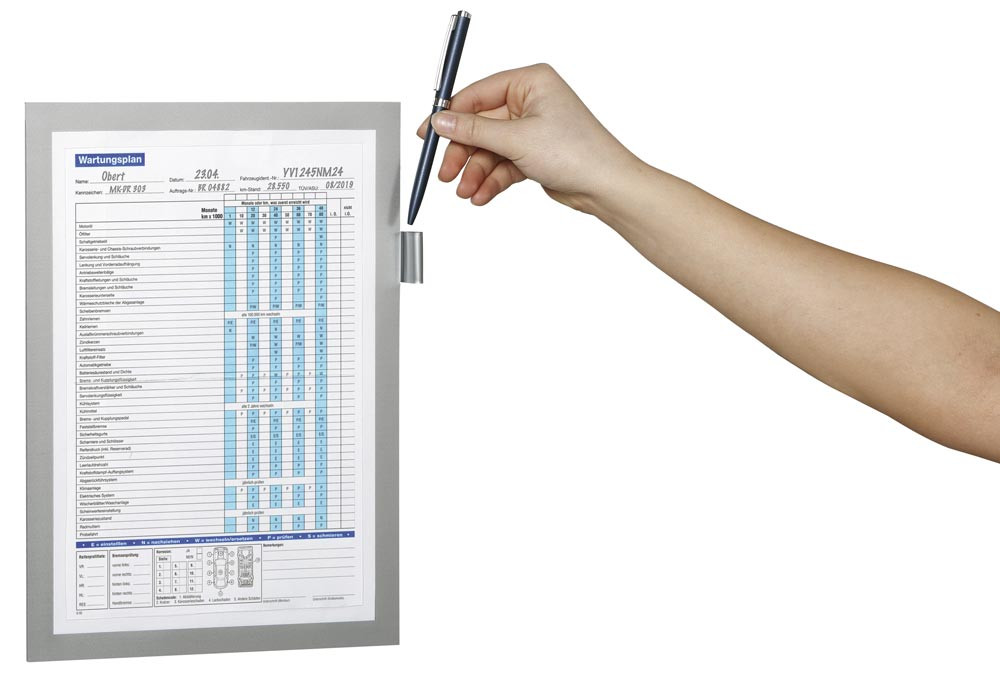 ∙ Direktes Beschriften des Dokuments möglich, da Aussparung auf der Vorderseite ∙ Der Magnetrahmen haftet auf allen metallischen Oberflächen ∙ Mit Stiftehalter für alle Stifte mit Befestigungsclip