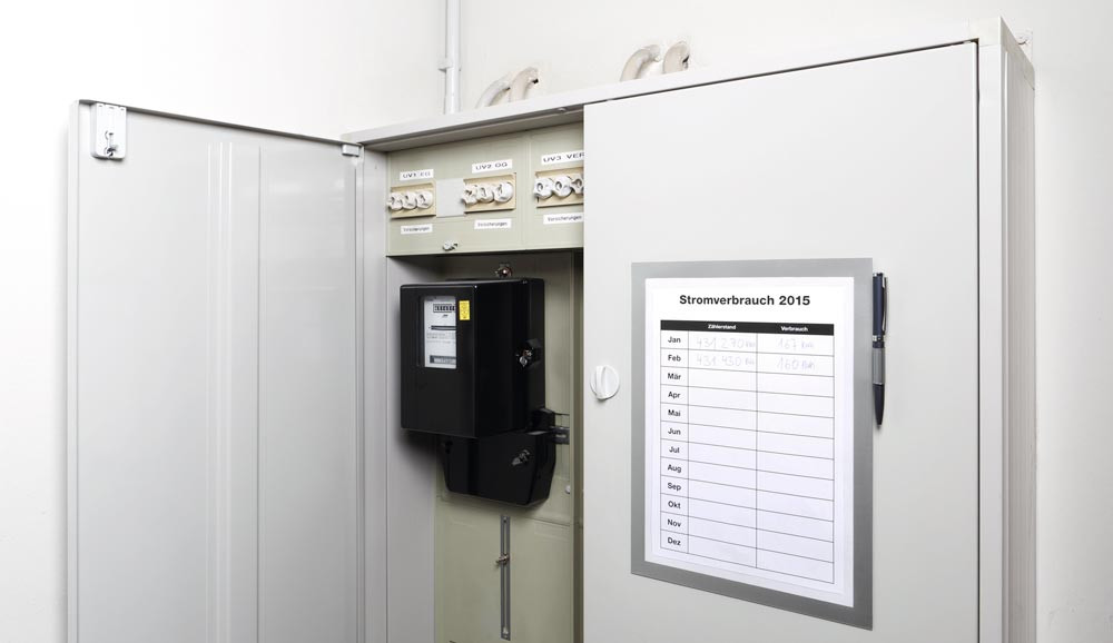 selbstklebend · Format DIN A4 · magnetische Vorderseite für schnelles und bequemes Wechseln von Informationen · direktes Beschriften des Dokumentes · Füllhöhe bis zu 5 Blatt 80g/qm · Stiftehalter für alle Stifte mit Befestigungsclip · haftet dauerhaft auf allen glatten Oberflächen