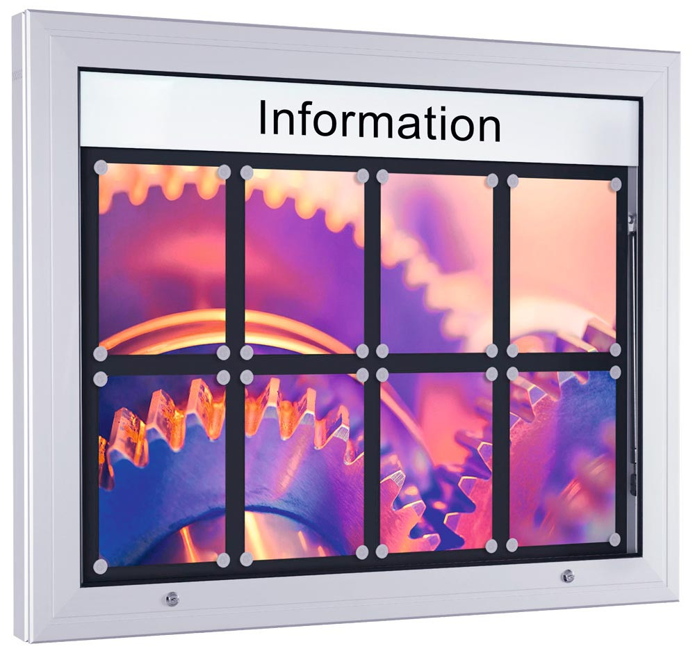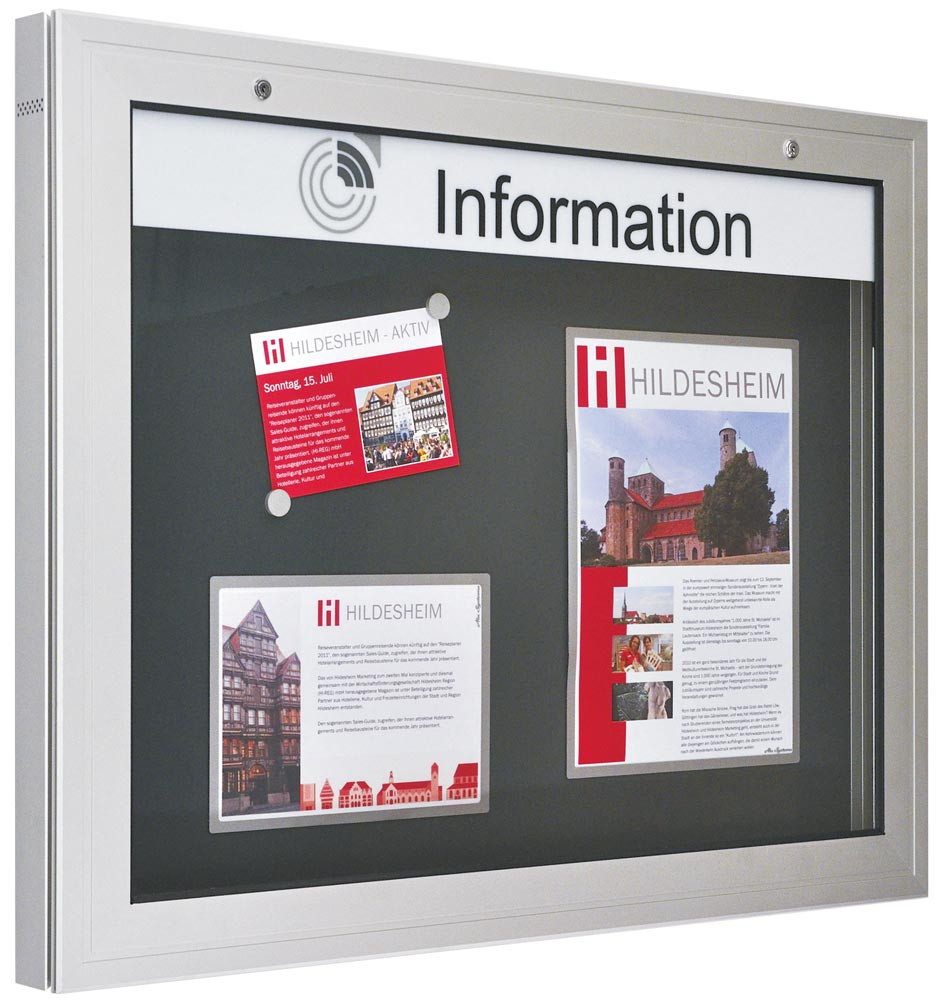 ∙ Formschöne Schaukästen die allen Anforderungen zum Informieren von Mitarbeitern, Kunden oder Mitbürgern entsprechen ∙ Wartungsfreie, korrosionsbeständige Aluminiumkonstruktion, silberfarbig eloxiert ∙ Flügeltür mit Einscheibensicherheitsglas (ESG) ∙ Abschließbar ∙ Regen- und staubdicht durch eckverschweißte Dichtungen ∙ Integriertes Belüftungs- und Entwässerungssystem ∙ Rückwand magnethaftend ∙ Entsprechend den Brandschutzbestimmungen B1 ∙ Für Wand- und Ständermontage ∙ Inkl. 10 Magnete grau und 1 Einstecktasche DIN A4 ∙ Lieferung ohne Schriftleiste oder Ständergarnitur (siehe Zubehör)