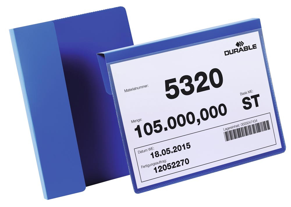 · Stabile Falz zum Anbringen von Informationen an Kartons, Boxen oder anderen Behältern · Dokument wird durch drei geschlossene Seiten geschützt · Falz kann auch alternativ zwischen gestapelten Kartonagen gesteckt werden · Farbige Rückenfolie und transparente Vorderfolie aus strapazierfähiger Hartfolie · VE 50 Stück