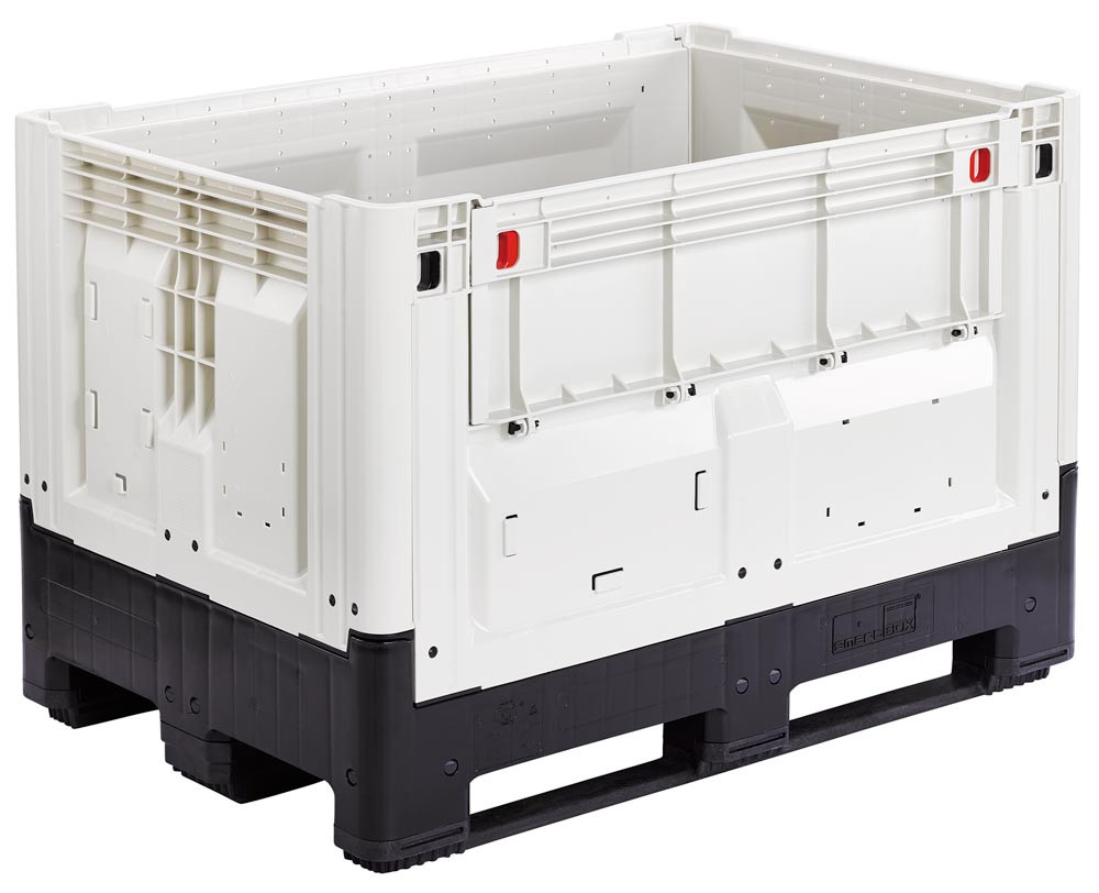 · Aus recyclebarem Polyethylen · Inklusive Entnahmeklappe an einer Längsseite · Ideal für eine ökonomische und zuverlässige Lagerung in der Industrie, dem Handel oder der Landwirtschaft · Einfaches Aufrichten und Zusammenklappen für eine Verbesserung der Betriebsabläufe Zusammenklappen der Wände ermöglicht je nach Höhe einen Raumgewinn von 1:2 oder 1:3 · Passgenaue Stapelung möglich · Farbe schwarz/elfenbein