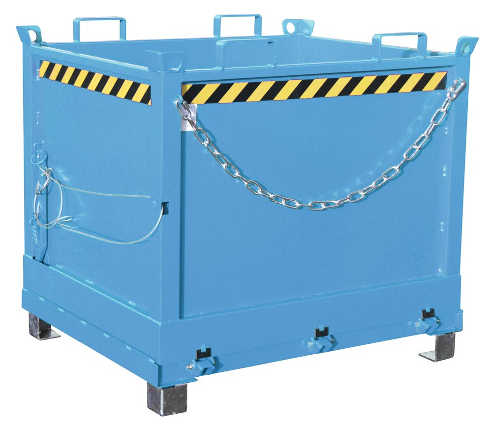 ∙ Entriegelung der Bodenklappe per Seilzug vom Stapler aus ∙ Bodenklappe schließt beim Aufsetzen selbsttätig, 90° Öffnungsbereich ∙ Sicherung für Bodenklappe gegen Abrutschen und ungewünschtes Öffnen ∙ Aufnahme für Gabelstapler und Kran sowie mit Gabelhubwagen transportierbar ∙ Robuste Stahlblechkonstruktion: Wandstärke 3 mm, Bodenklappenstärke 4 mm ∙ Einfahrbügel an der Oberseite des Behälters, Einfahrtaschen an der Unterseite · Unterfahrhöhe 100 mm