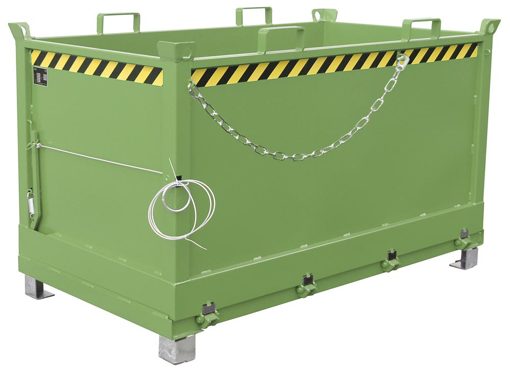 ∙ Entriegelung der Bodenklappe per Seilzug vom Stapler aus ∙ Bodenklappe schließt beim Aufsetzen selbsttätig, 90° Öffnungsbereich ∙ Sicherung für Bodenklappe gegen Abrutschen und ungewünschtes Öffnen ∙ Aufnahme für Gabelstapler und Kran sowie mit Gabelhubwagen transportierbar ∙ Robuste Stahlblechkonstruktion: Wandstärke 3 mm, Bodenklappenstärke 4 mm ∙ Einfahrbügel an der Oberseite des Behälters, Einfahrtaschen an der Unterseite · Unterfahrhöhe 100 mm