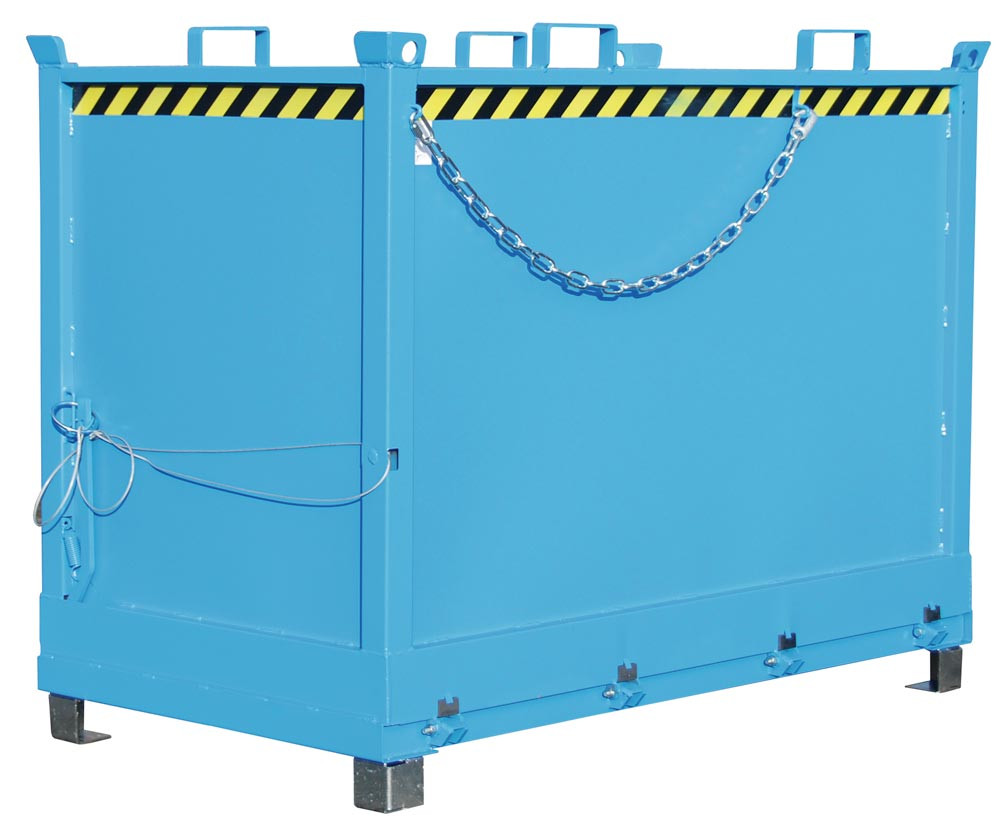 ∙ Entriegelung der Bodenklappe per Seilzug vom Stapler aus ∙ Bodenklappe schließt beim Aufsetzen selbsttätig, 90° Öffnungsbereich ∙ Sicherung für Bodenklappe gegen Abrutschen und ungewünschtes Öffnen ∙ Aufnahme für Gabelstapler und Kran sowie mit Gabelhubwagen transportierbar ∙ Robuste Stahlblechkonstruktion: Wandstärke 3 mm, Bodenklappenstärke 4 mm ∙ Einfahrbügel an der Oberseite des Behälters, Einfahrtaschen an der Unterseite · Unterfahrhöhe 100 mm